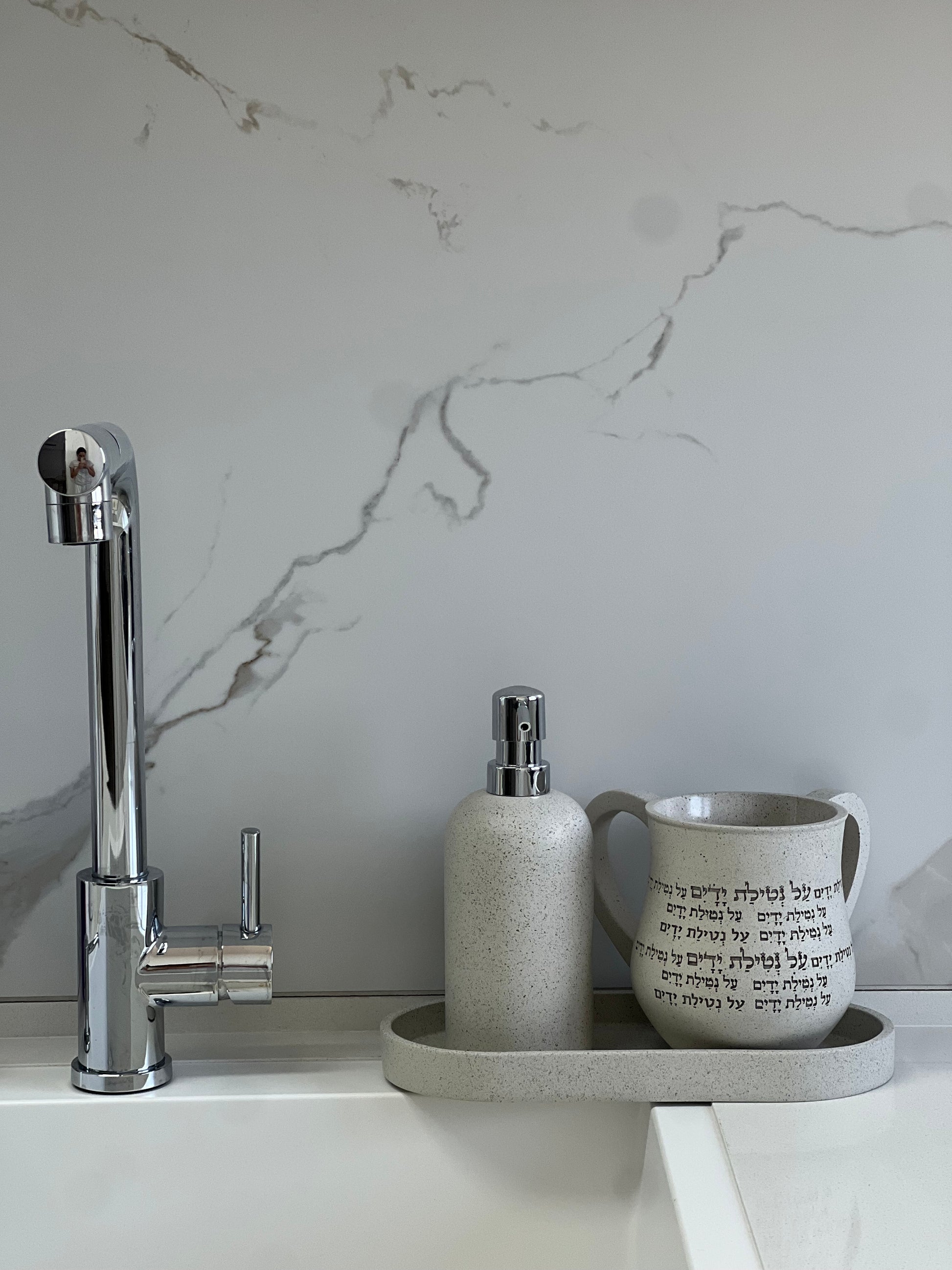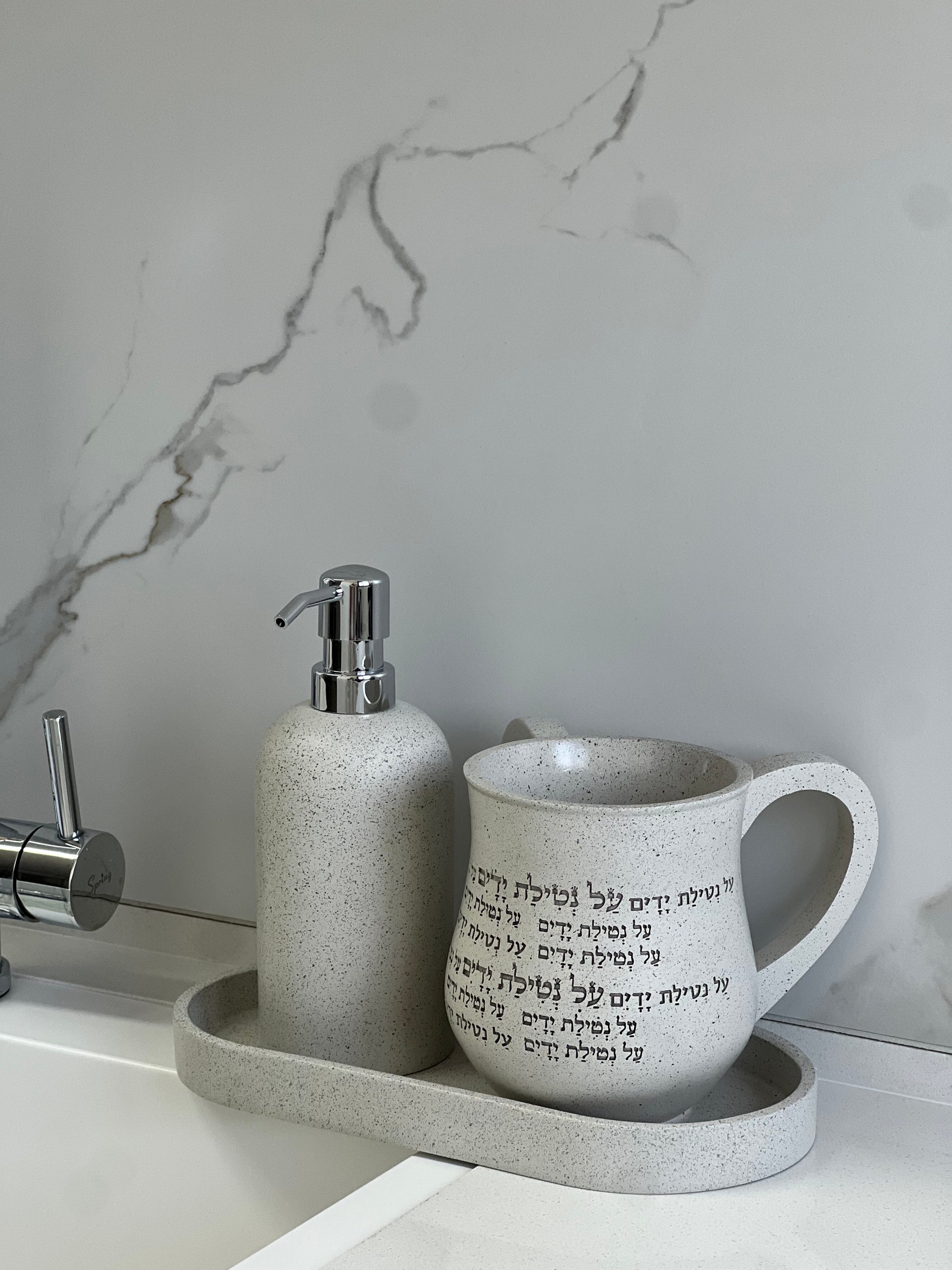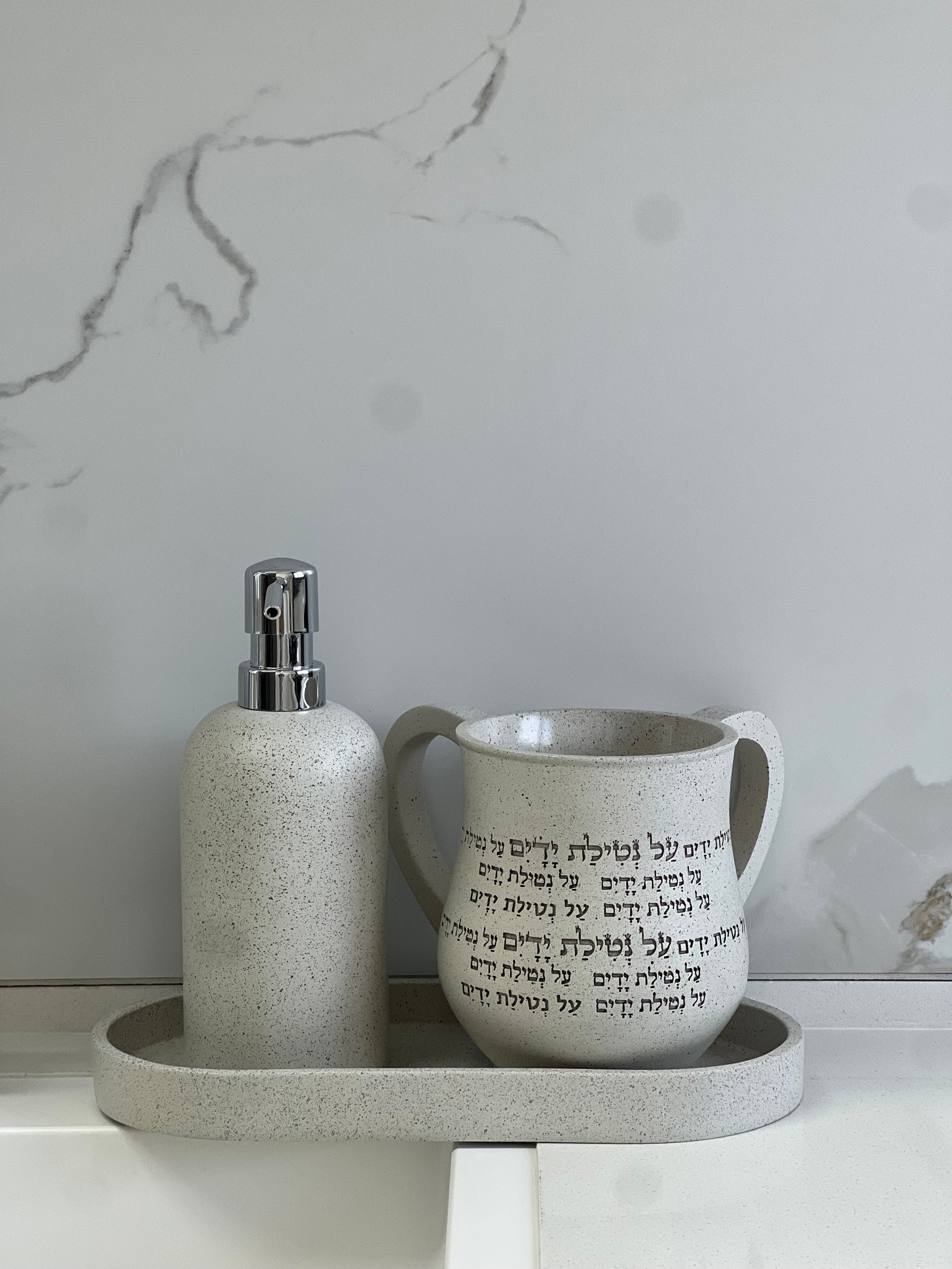 סט מושלם של נטלה 14 ס״מ, סבוניה ומגש עם טקסטורה מיוחדת בגוון שיש. חומר פוליריזין המשובח